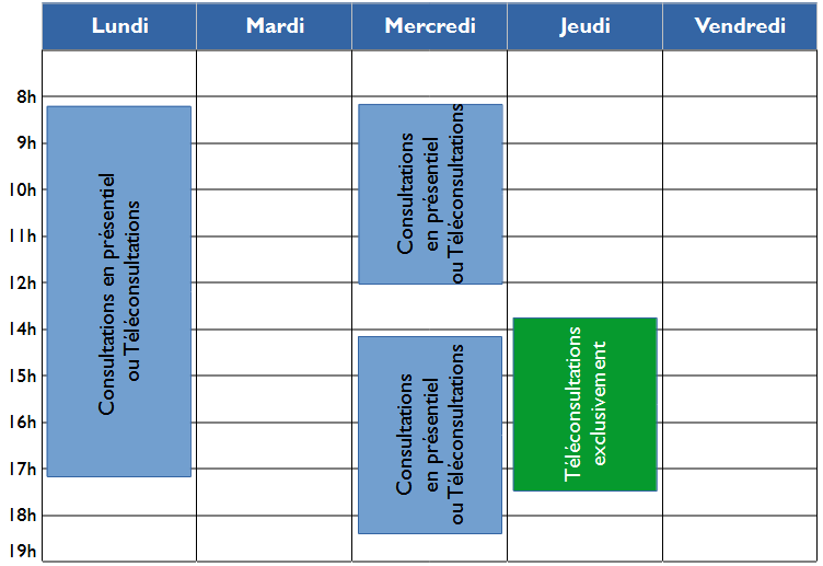 Les jeudis et mardis après-midi (de 13h55 à 17h35) sont réservés exclusivement à la téléconsultation.